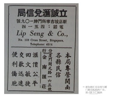 凭借贸易港口的优势,新加坡一直是东南亚邮政与贸易的中心,更是本区域最重要的侨批中转站。在侨批局出现之前,1847年新加坡就有1000多位水客,他们往返中国和新加坡,替那些在狮城打拼的华侨把家书、银钱和物品带回侨乡。到1887年,新加坡陆续出现了49家民营侨批局,根据服务对象的原籍地大致分为福州帮、潮州帮、琼州帮、广东帮及客家帮,其中福州帮根据方言又划分出不同的帮系,而来自厦门、金门、南安、永春、海澄等以闽南方言为主的县市的华侨所经营的侨批局就属于闽南帮。这些民营侨批局在新加坡设立总局,同时在福建南部各主要城市设立分局。据相关统计,截至1936年,福建各地民信局共有126家,其中厦门数量最多,共有84家。