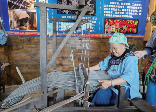 竹山苗寨内,苗族阿婆展示织布技艺。