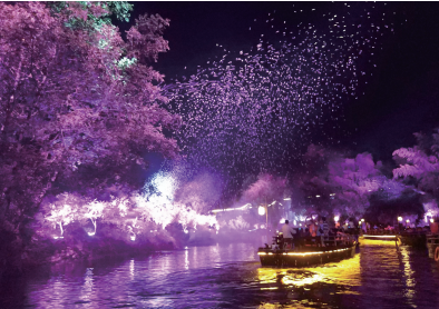 夜幕中,在一声“开船喽”的口号后,采访团一行乘游船开启体验。演出在朦胧烟雾中启幕,鸡鸭牛羊狗猪随剧情登场,田间身影与月光交辉,有记者笑称“牛这么晚还上班,太敬业了”,引得满船欢笑。近一小时的演出里,繁星灯火映照着水面,落幕时漫天飞舞的花瓣,让众人频频鼓掌。